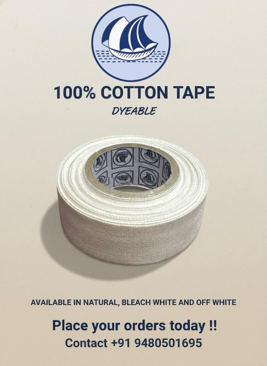 100% Pure Cotton Tape (Dyable) is manufactured from premium-quality natural cotton fibers, ensuring softness, strength, and excellent flexibility. Free from synthetic blends, this tape is specially designed to absorb dyes evenly, making it ideal for applications that require custom colors or branding. Its natural finish provides a clean base for dyeing, printing, or finishing as per requirement.